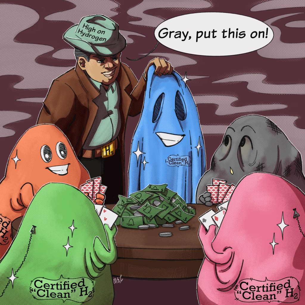 This week, our fossil fuel nemesis, Watery Green, is handing a blue hydrogen costume to a gray hydrogen molecule. Blue hydrogen is just gray hydrogen masquerading as “clean” hydrogen. Hydrogen can be produced many ways, so scientists have taken to assigning colors to the different forms according to the feedstock and production process. Gray signifies dirty hydrogen made from methane using steam methane reforming. Blue is exactly the same except that carbon capture and storage (CCS) is added to the process. If you followed Week 1 of PA Energy Month, you know that CCS is a sham. But even if it wasn’t, even if it captured all of the CO2 emissions and permanently sequestered them, it would never address all of the climate-killing methane emissions that come from producing the feedstock and powering the process.